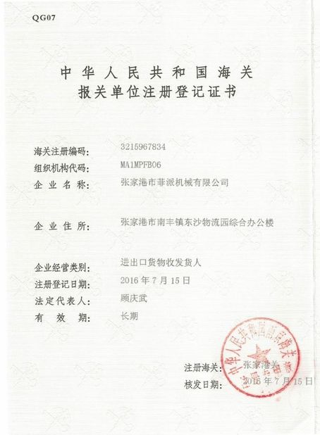 | صادر شده توسط: | ZHANGJIAGANG CITY MARKET SUPERVISION AND ADMINISTRATION BUREAU |