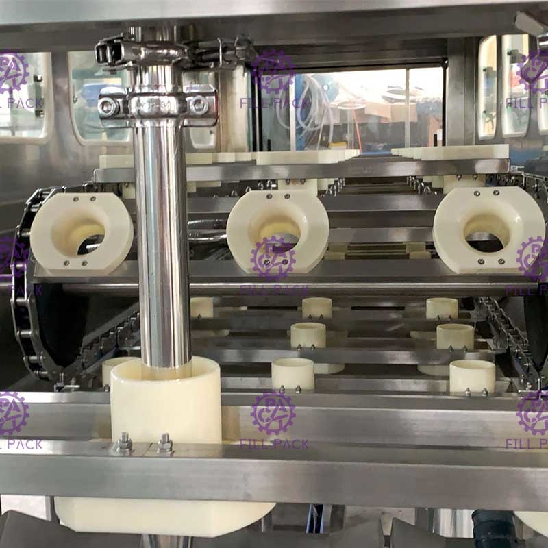 سطل تمیز شده توسط مکانیسم حمل زنجیره ای حمل می شود و بر روی مکانیسم سطل می افتد. مکانیسم سطل سطل خالی را اصلاح می کند، شیر پر کردن فشار داده می شود،و پر کردن شروع شدزمان پر کردن می تواند با توجه به سرعت جریان پمپ پر کردن تنظیم شود.